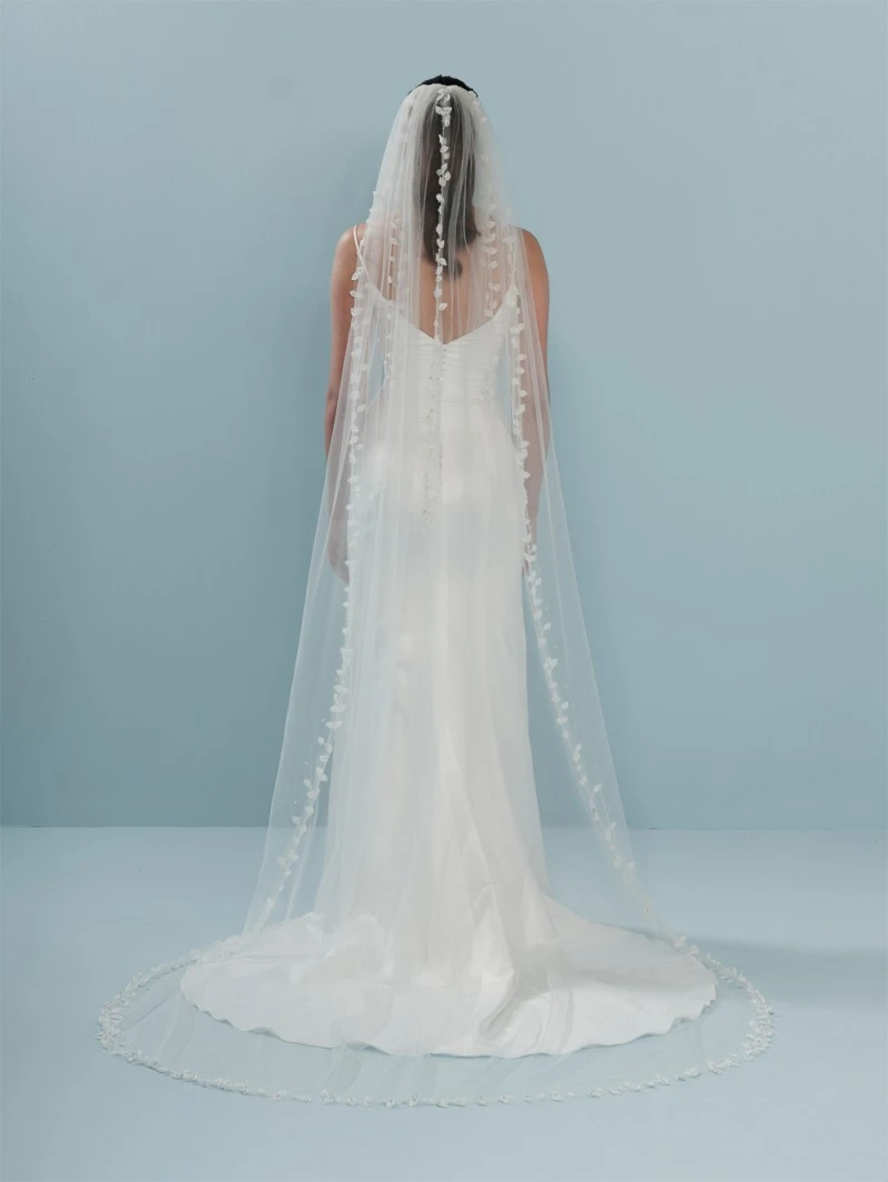 Details: luxe enkellaagse ivoorkleurige soft-tule sluier, organza bladeren, kristallen, pailletten, rhinestones